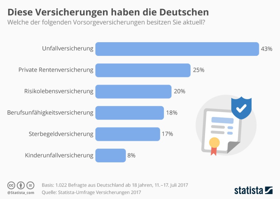 Geht es um Vorsorgeversicherungen greifen die Bundesbürger am ehesten zur Unfallversicherung – 43 Prozent haben ein solches Produkt. Das zeigt eine aktuelle Umfrage des Datenportals Statista. Die Berufsunfähigkeitsversicherung indes findet man nur in rund jedem fünften Versicherungsordner in Deutschland.
